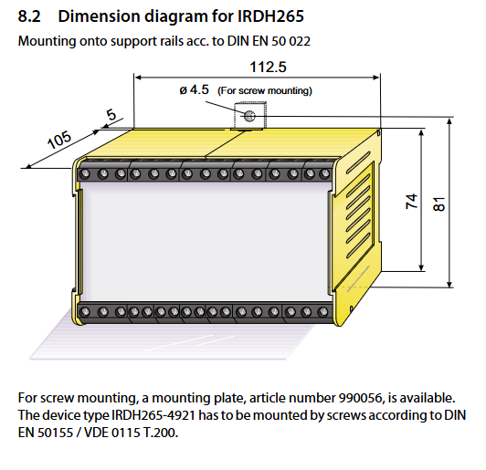 IRDH265 XM112 (halogen-free) DIN rail installation (DIN EN 50022) or screw installation (accessory 990056 required) – rigid conductor 0.2… 4mm ², flexible conductor 0.2… 2.5mm ² (compatible with AWG 24… 12) shell IP30, terminal IP20 approximately 825g