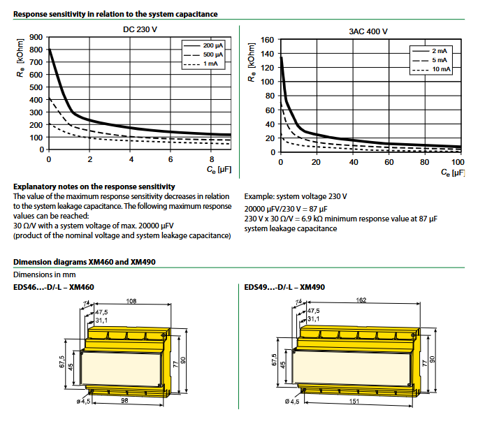 Response sensitivity EDS460/490 insulation fault location response value 2… 10mA; residual current measurement 100mA… 10A main circuit, industrial general scenario