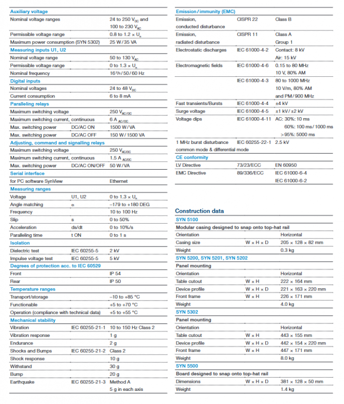 SYN 5202 Dual Channel Automatic Synchronization System (Serial Synchronization Check) Panel Installation 221 × 163 × 220 mm 4.0 kg