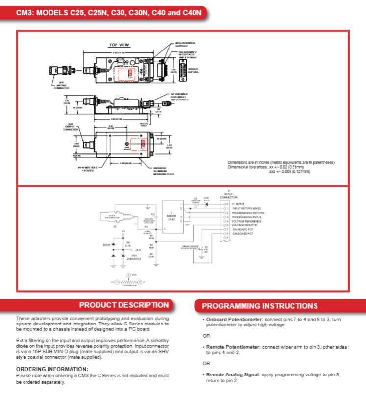 CM3 adapter kit: compatible with C25-C40 models, supports chassis installation, includes SHV output connector, reverse polarity protection
