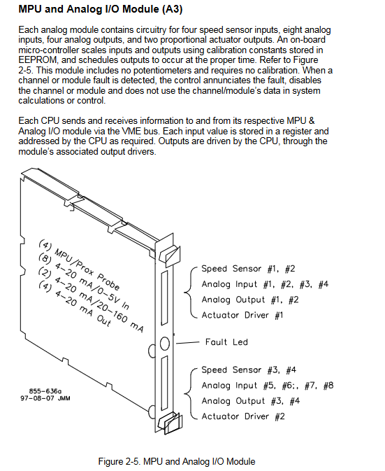 Analog I/O module speed input: 4 channels (MPU/proximity probe, 0.5-25kHz); Analog input: 8 channels (4-20mA, accuracy 0.1%); Analog output: 4 channels (4-20mA, load 600 Ω); Output of actuator: 2 channels (4-20mA/20-160mA, software optional)