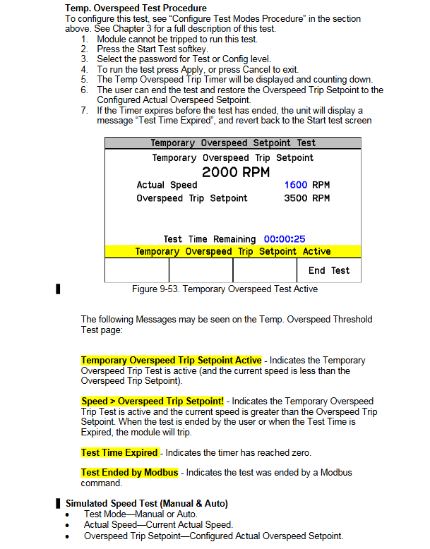Temporary overspeed test verification overspeed trip function test set point 0-32000 RPM, timeout 0-1800 seconds device does not trip, test level/configuration level password required