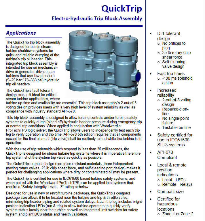Question 1: What are the core safety design and certification highlights of QuickTrip electro-hydraulic trip block components, and how do they ensure the reliability of critical applications?