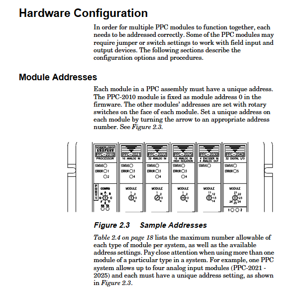 Core modules: PPC-2010 processor (48 digital I/O channels, 2 serial ports), PPC-202x analog input module (16/32 channels), PPC-2030 encoder input+analog output module, etc