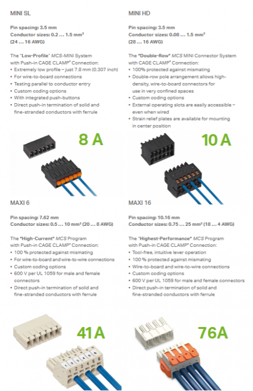 WAGO MCS Multi Connection System is a CAGE CLAMP based system ® Or push in CAGE CLAMP ® The modular connector series of connection technology covers 7 product series including MICRO, MINI, MIDI, MAXI, etc. The pin spacing is 2.5-10.16mm, and it is compatible with 0.08-25mm ² (28-4 AWG) conductor specifications. It supports multiple connection methods such as wire to board, wire to wire, and board to board, and has 100% anti misoperation protection, custom coding, integrated buttons, and other features. The rated current is 6-76A and the rated voltage is up to 600V. It provides various versions such as THR reflow soldering and crimping installation, and is suitable for different application scenarios such as high-density connection and high current transmission of industrial equipment.