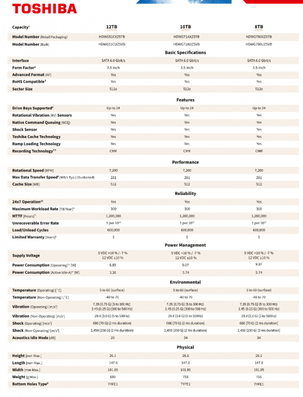Unrecoverable error rate: 4TB-10TB, 22TB-24TB are 1/10 ¹⁵, 12TB-14TB are 1/10 ¹⁴, high data security