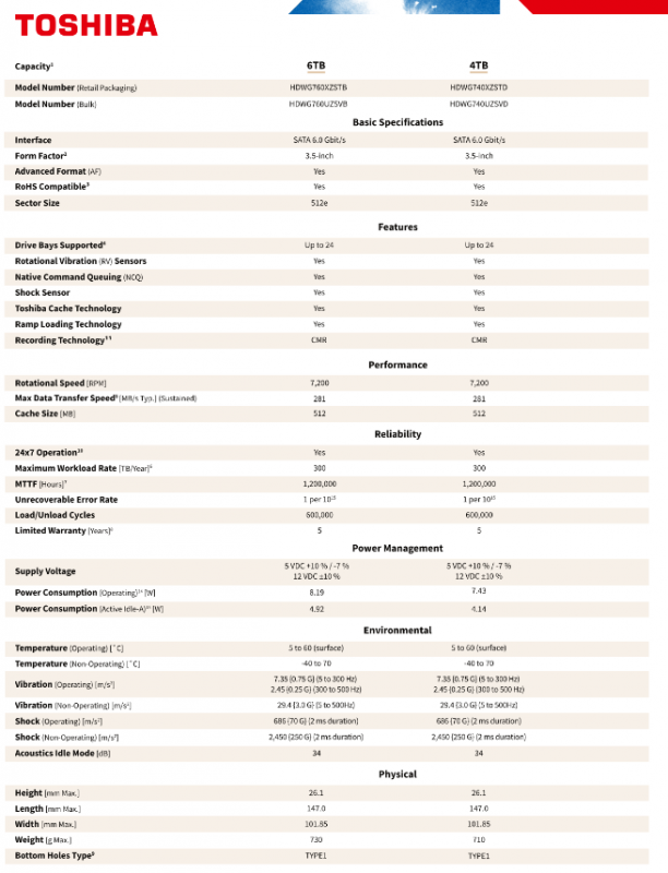 6TB HDWG760XZSTB HDWG760UZSVB 512MB 281 300 1,200,000 1/10¹⁵ – 4.92 730 34