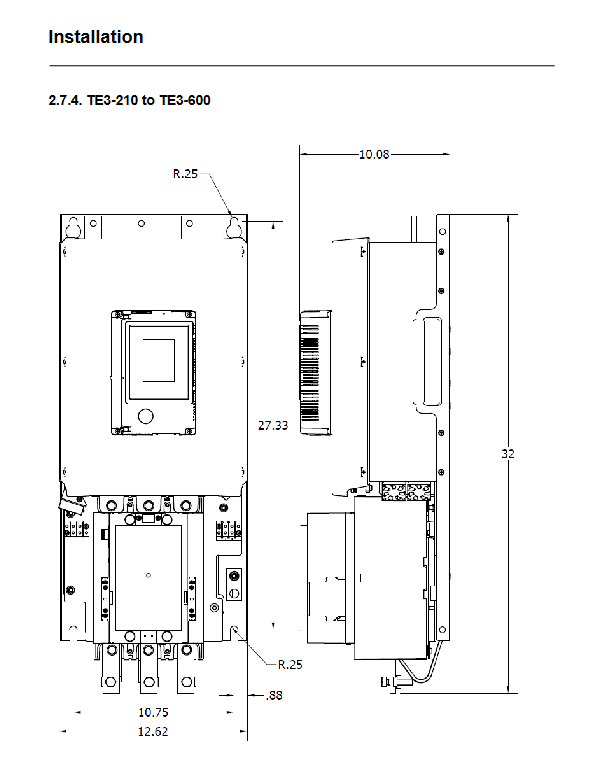 Installation method: Vertically installed on a flat surface, with reserved ventilation gap (minimum 25mm, 127-483mm for high current models).