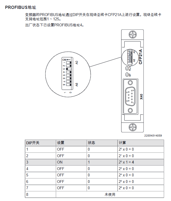 Address setting: Use the DIP switch of CFP21A to set the PROFIBUS address (1-125)