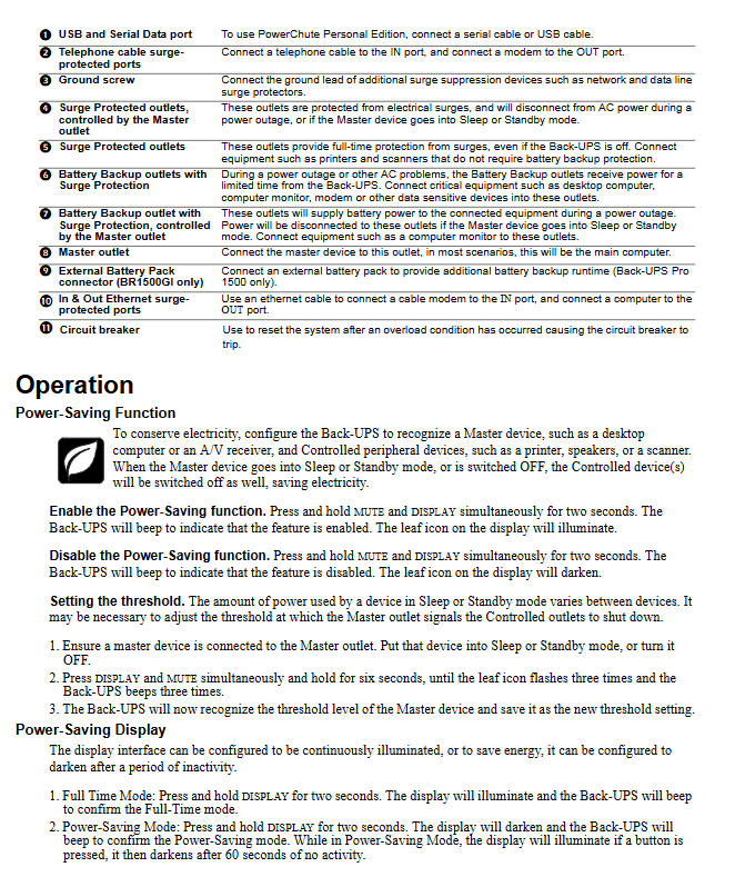 Enable/Disable: Long press the “MUTE” and “PLAY” buttons on the front panel for 2 seconds, the UPS beeps and the “leaf icon” on the display screen lights up/goes out to indicate whether the function is enabled/disabled.