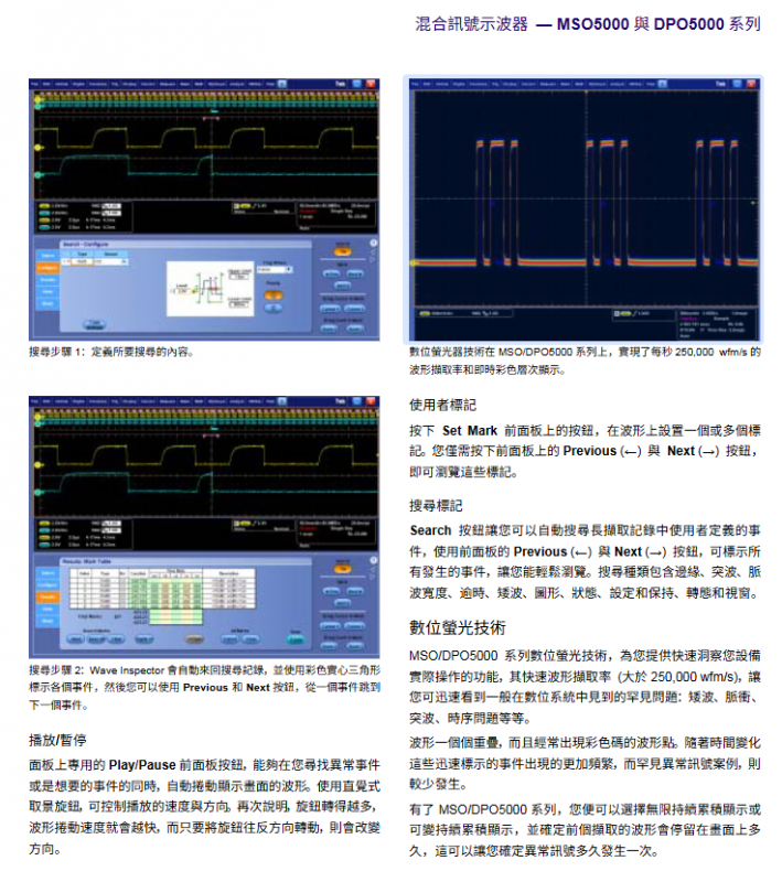 The Tektronix MSO5000 and DPO5000 series mixed signal oscilloscopes are high-performance testing instruments that cover a bandwidth of 350MHz-2GHz, with a maximum real-time sampling rate of 10GS/s for single/dual channels and 5GS/s for four channels. They come standard with a 12.5M sampling point recording length (optional extension to 250M), and the MSO series provides an additional 16 digital channels. The core advantages include a waveform capture rate of>250000 wfms/s Wave Inspector ®  Waveform inspection, 53 automatic measurements, FFT analysis and other functions, support I ² C/SPI/USB serial trigger decoding (optional), equipped with a 10.4-inch touch screen and rich interfaces (USB, LAN, GPIB), lightweight body (≤ 6.7kg), suitable for complex circuit design verification, mixed signal error correction, serial bus analysis and other professional scenarios.