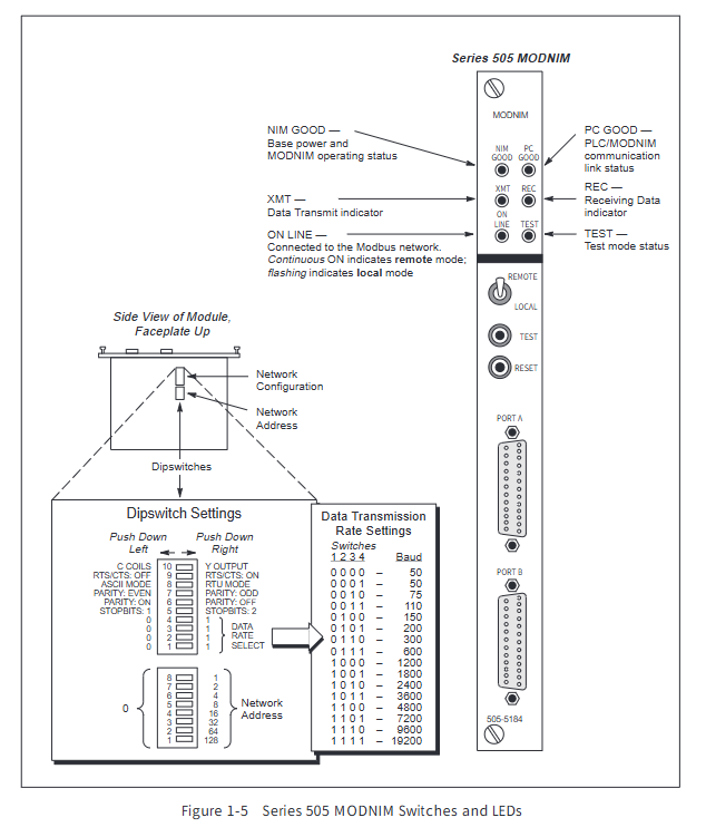 The SIMATIC TI505/TI500 MODNIM User Manual (order number PPX: 505-8122-1) is a full process guide for the PPX: 505-5184 (TI505 series) and PPX: 500-5184 (TI500 series) Modbus network interface modules. The core covers four modules: installation configuration, Modbus protocol parsing, functional instruction description, and troubleshooting. It supports two ASCII/RTU transmission modes, 15 core Modbus function codes, and adapts to 50-19200 bps transmission rates. The network address (1-247) and communication parameters need to be configured through dip switches, and module debugging can be achieved with MODASST diagnostic software. It is suitable for Modbus master-slave network communication between PLCs and hosts in industrial environments.