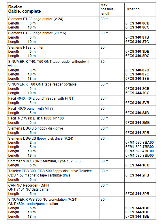 Ordering information: Clearly specify the cable ordering number and maximum length (mainly 30m, some up to 100m) for each type of equipment.