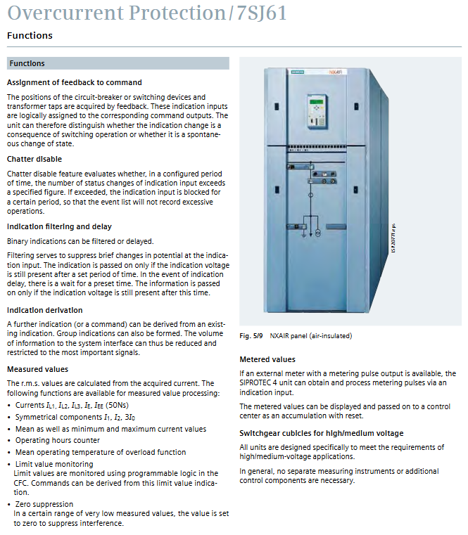 Overcurrent protection relay 7SJ61 for non directional overcurrent, ground fault, motor protection circuit, motor, and transformer backup protection