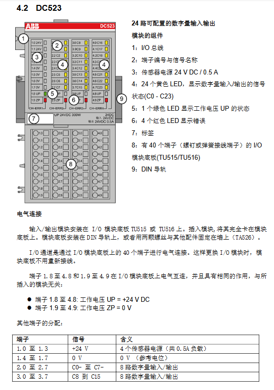 The ABB AC500 series PLC module wiring guide focuses on the wiring, installation, and safety specifications of various IO modules in this series of PLCs, covering multiple types of modules such as switch quantity, analog quantity, hybrid module, position module, bus interface module, CPU integrated IO, and communication card. It clarifies the terminal allocation, electrical connection method, power requirements, and anti-interference measures of each module, emphasizes safety points such as power-off operation, correct grounding, and cable selection, and details core concepts such as source/drain type differences and analog wiring system differences, providing comprehensive wiring technical support for PLC system construction.