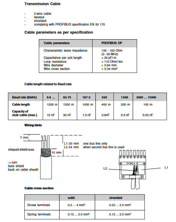 Cable requirements: PROFIBUS cables must comply with the EN 50170 standard, with a characteristic impedance of 135~165 Ω and a wire diameter of ≥ 0.64mm.
