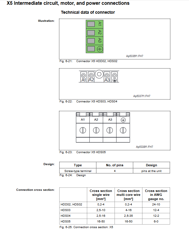 X5 interface (shared by both): DC bus, motor and power connection, EcoDrive 03 wiring cross-sectional area of up to 25mm ², tightening torque of 2.5-3.0Nm.