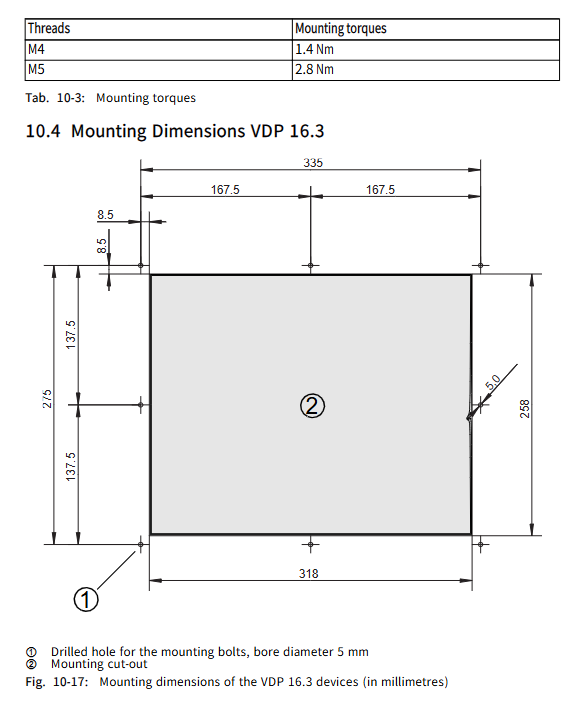 Installation Cut Size (Table): | Model | Installation Cut Width × Height (mm) | Installation Bolt Hole Diameter (mm) | Bolt Quantity | | —- | —- | —- | | | | | VDP 16.3 | 335 × 275 | 5 | 8 | | | VDP 40.3 | 392 × 355 | 5 | 8 | | VDP 60.3 | 463 × 370 | 5 | 8|