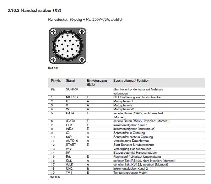 X3 (Handschauber) circular plug 19+PE motor connection U/V/W=motor phase line, TMA=motor temperature sensor