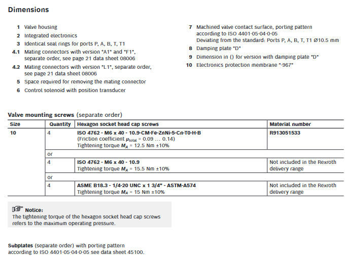 Installation surface: Surface roughness Rzmax 4, flatness 0.01/100mm, requires the use of specified M6 × 40 installation screws, tightening torque 12.5Nm (Rexroth original screws) or 15.5Nm (universal screws).