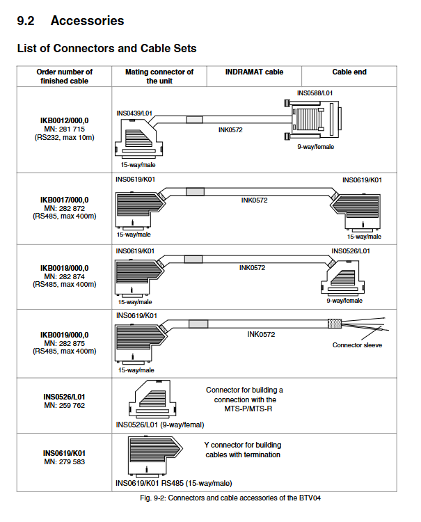 |IKB0012 | RS232 | 10m | One end INS0439/L01, one end INS0588/L01 | PC and BTV04 debugging connection|