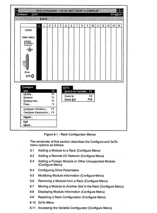 Rack configuration: Supports 10/16 slot racks, can add/remove/move modules, and configure remote I/O networks (AutoMax/Shark rack Remote Head)