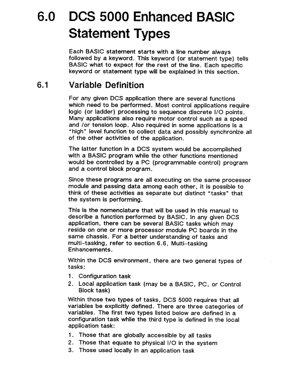 Reliance Electric DCS 5000 Enhanced BASIC is a programming language suitable for industrial real-time control scenarios. Based on standard BASIC extensions, it supports 5 types of variables (single precision integer/double precision integer/real/boolean/string), multitasking concurrent execution, hardware/software event synchronization, and multi protocol I/O communication (Modbus/Allen Bradley, etc.), providing 34 built-in functions such as arithmetic/string/bit operations. It requires defining global variables and I/O mapping through configuration tasks, implementing control logic through application tasks, and supporting complete error handling mechanisms and version compatibility explanations. Its core is used for industrial equipment control and data processing in DCS 5000 systems.