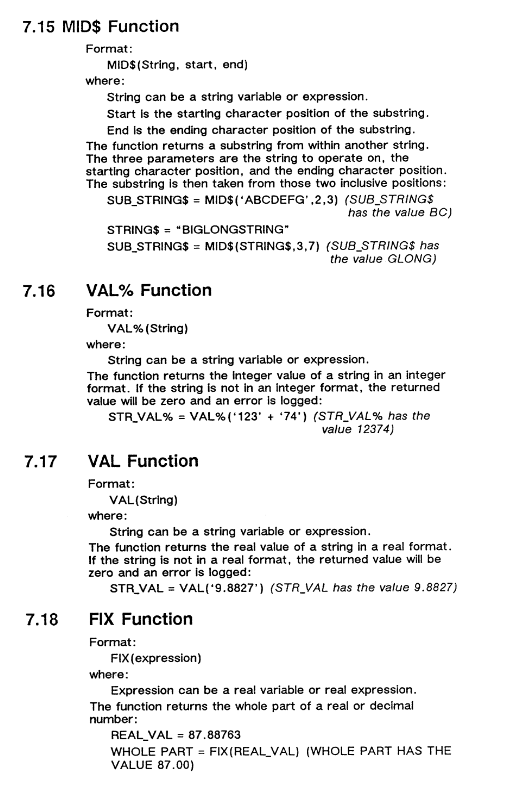 (String truncation), LEN% (length), STR $/VAL/VAL% (numeric string conversion)
