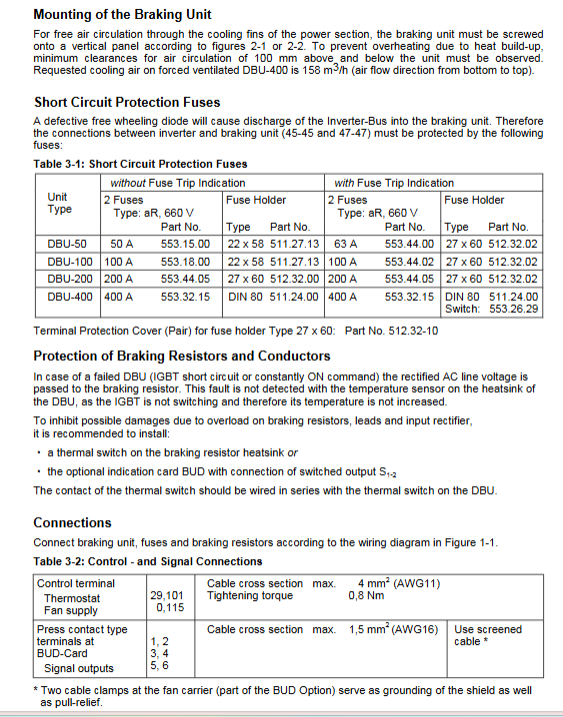Short circuit protection: aR type fuses need to be connected in series between the frequency converter and DBU, with specifications as shown in the table below: