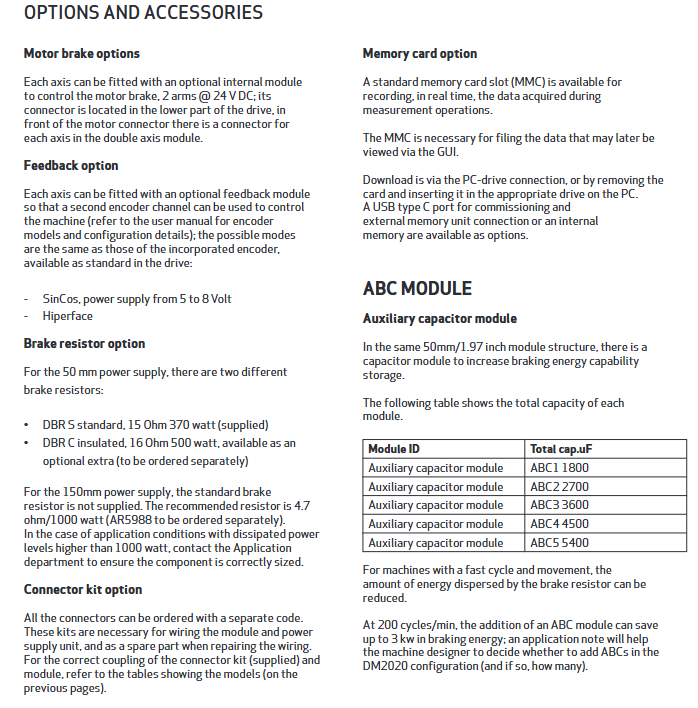 Auxiliary capacitor module (ABC) ABC1-ABC5 with a capacity of 1800-5400 μ F increases braking energy storage and reduces braking resistance losses (200 cycles per minute can save 3kW)