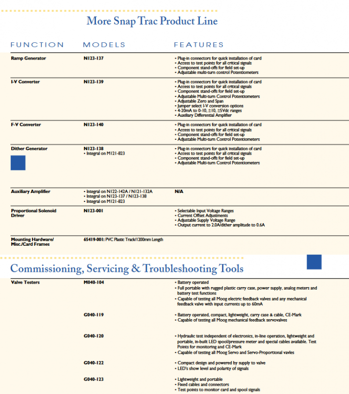 Moog servo electronic equipment is a modular product system designed for the needs of electro-hydraulic servo control. Its core advantages lie in modular combination, multi voltage compatibility, and wide temperature adaptability. It can be customized to build open-loop/closed-loop control systems through Eurocard, Snap Trac, DIN Rail modules and supporting sensors and testers, covering the full scenario requirements from single axis simple control to multi axis complex collaboration. It is widely used in industrial automation, hydraulic systems, valve control and other fields.