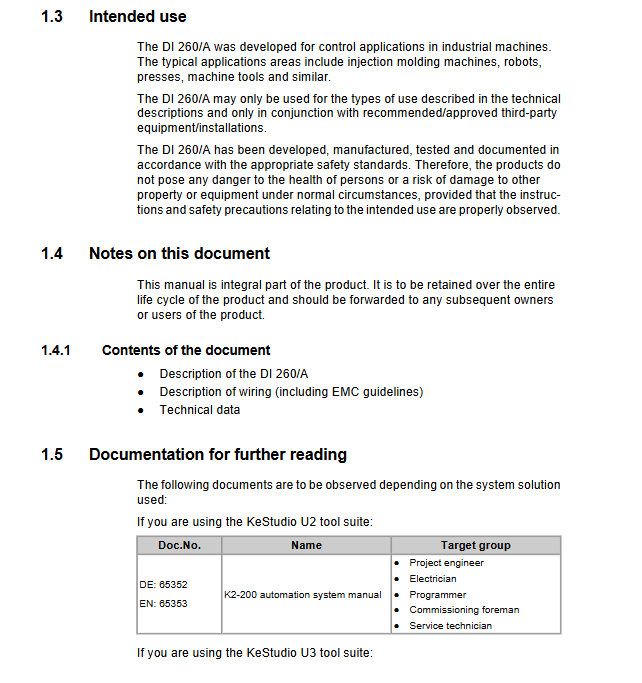 DI 260/A is a digital input module designed by KEBA specifically for industrial automation scenarios. Its core is used to collect external digital signals and transmit them to control systems, adapting to equipment such as injection molding machines, robots, presses, and machine tools. The module is positioned as an engineering level component, only aimed at project engineers, operators, and service technicians (who need to have relevant knowledge of PLC working principles, safety regulations, etc.), and is not directly aimed at end users. Terminal safety instructions need to be integrated into the user manual by the equipment manufacturer.