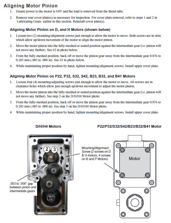 Gear mesh clearance: After the motor small gear meshes with the intermediate gear, it needs to be retracted by 0.076~0.203mm (0.003~0.008 inches) to ensure the mesh clearance.