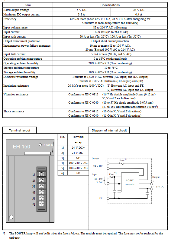 Power module: AC type (EH-PSA, input 100-240V AC), DC type (EH-PSD, input 21.6-26.4V DC), output 5V DC (3.8A)