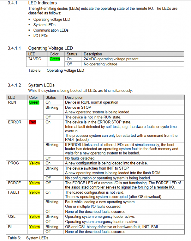 System LED FAULT (yellow) on/flashing/off configuration invalid/OS download fault/I/O fault/no fault