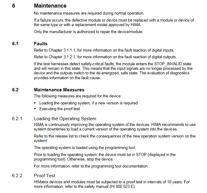 Maintenance requirements: Normal operation does not require routine maintenance. In case of malfunction, the same model or HIMA approved replacement module must be replaced; Verification testing must be performed every 10 years (refer to safety manual HI 800 023 E); The operating system can be upgraded through programming tools (with the module in STOP state).