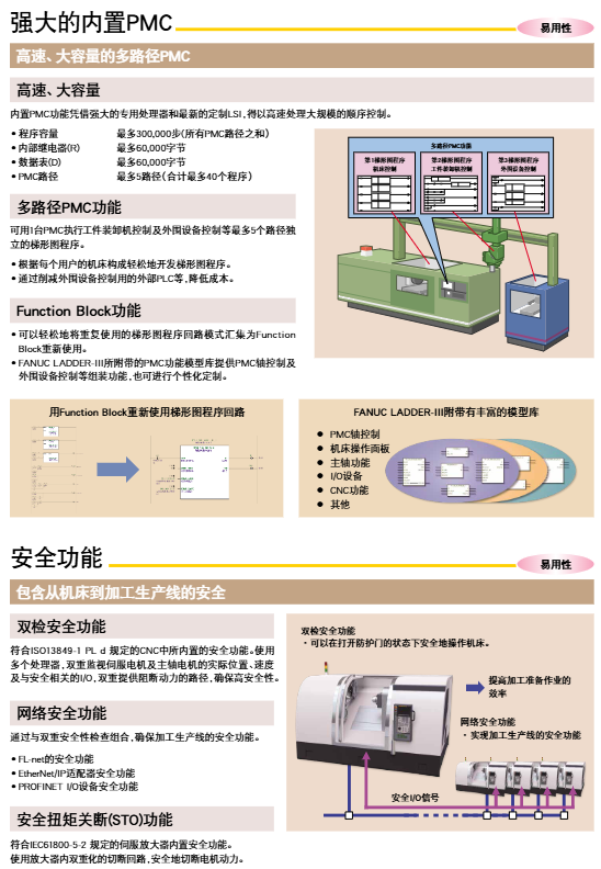 Sequential control customization: FANUC LADDER-III tool supports ladder diagram/Function BLOCK programming, can replace addresses with signal names, supports Ethernet online monitoring and editing, and comes with PMC function library.