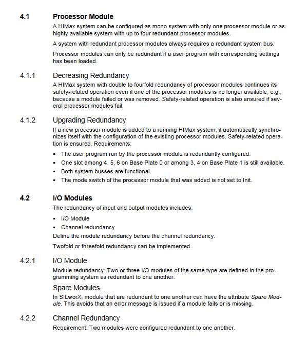 Fault handling: When a redundant module fails, it will automatically take over. If a non redundant module fails, it needs to be shut down for replacement. The faulty module is only authorized for maintenance by HIMA;
