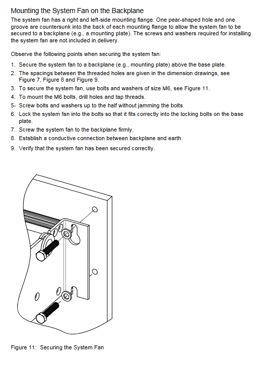 Backboard installation (such as X-FAN 10 01): 1. Use M6 bolts to fix the fan on the backboard above the substrate; 2. Confirm the spacing between threaded holes according to the dimension diagram; 3. When the bolt is tightened halfway, clamp the fan into the base plate locking bolt; 4. Tighten the bolts and establish a conductive connection between the backplate and the ground; 5. Verify the firmness of installation