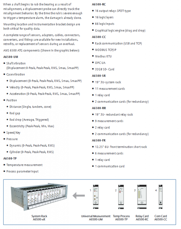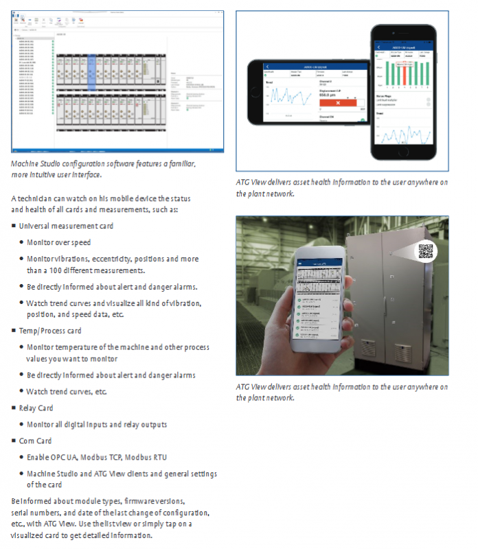 Monitoring parameters: covering over 100 measurement types such as shaft vibration (displacement/velocity/acceleration), position (distance/rod clearance/rod drop/eccentricity), speed/key phase, pressure, temperature, etc;