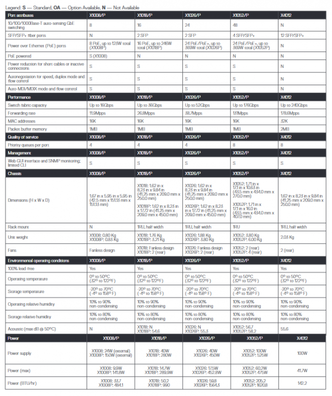 |X1052/P | Large office/small data center | 48 10/100/1000Base-T+4 SFP/SFP+ports | X1052P supports 24 PoE/PoE+ports (total power 369W), 1RU rack width|