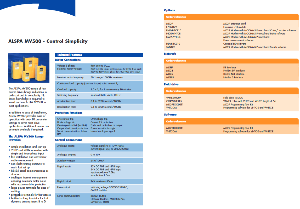 ALSPA MV500 0.25-15kW single/three-phase input, easy to install, only requires 10 basic parameters without encoder vector, VVVF overload 150%/1min, switch frequency 3/6/12kHz, protection IP20-IP54