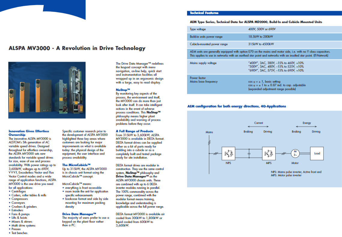 ALSPA MD2000 AEM 18.5-4500kW active energy management, energy bidirectional flow flux vector control power factor adjustable ± 1, harmonic distortion rate 3% -6%, 4-quadrant operation