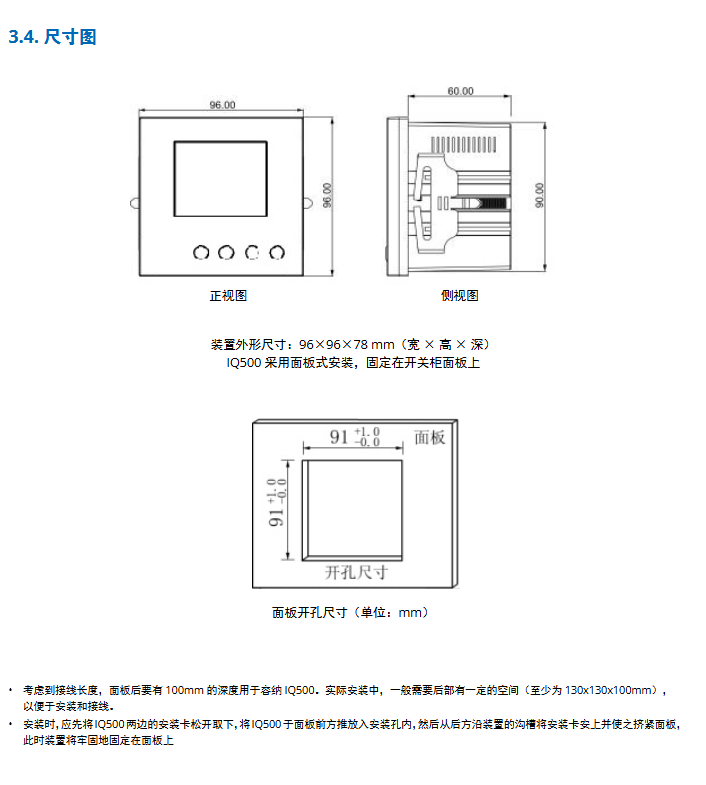 Appearance/Hole Size Appearance 96 × 96 × 78mm (width × height × depth), Panel Hole 91 × 91mm