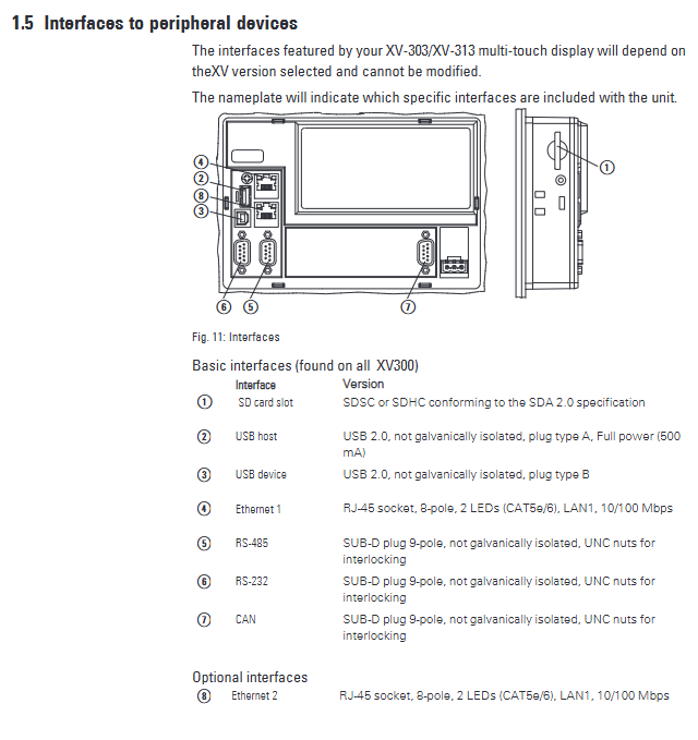 RS-232 (COM1) 9-pin SUB-D interface, no isolation, maximum baud rate 115200Bit/s (2.5m)