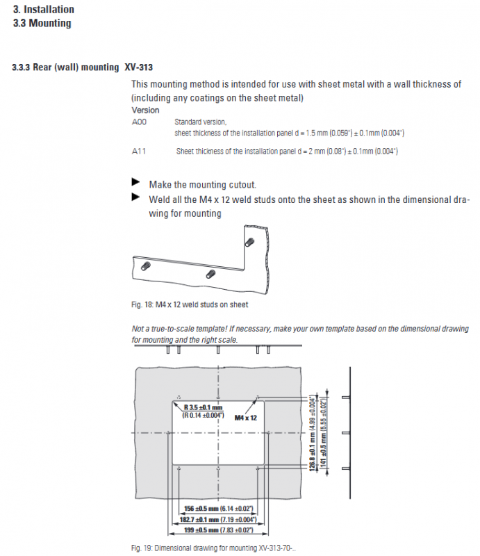 XV-303 (pre installation): Use 6/10/12 brackets (according to size) to fix from the back of the panel, with a tightening torque of ≤ 0.1 Nm for the brackets. Before installation, place a sealing strip in the equipment groove (with the joint facing downwards and no distortion) to ensure IP65 protection;
