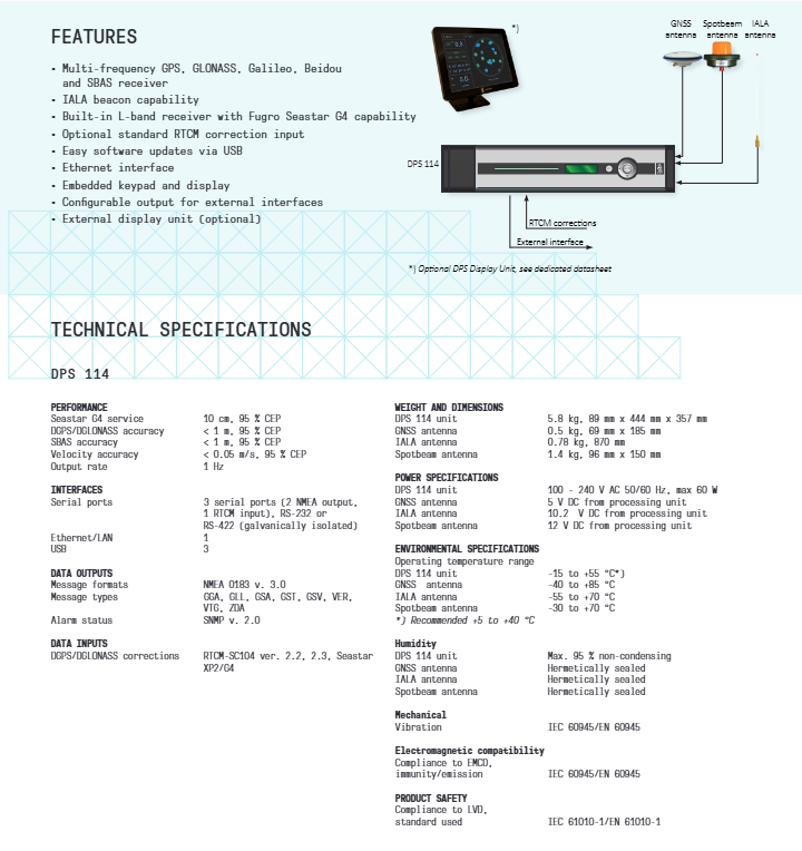The physical, power supply, environmental, safety and other technical specifications of DPS 114 comply with maritime industry standards. The core parameters are presented in three categories, and the hardware specifications include the host and multiple adaptive antennas: