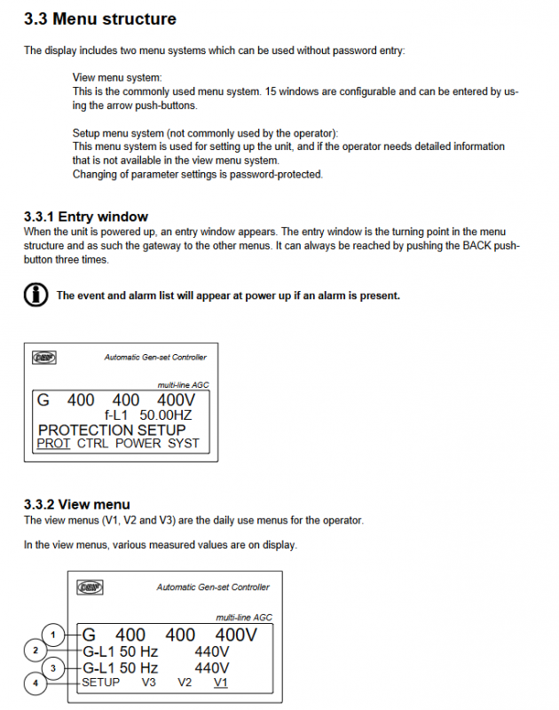 V2/V3 menu: Automatic switching type, automatically switches with the operating mode of the generator set (start preparation/synchronization/speed up/speed down/normal operation), without manual operation. V2 displays the measured values in full, V3 displays the status text in the first line and the measured values in the last two lines.