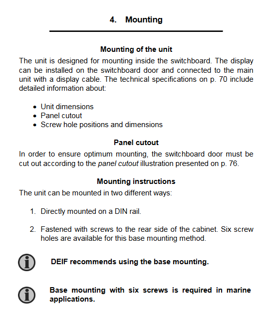 Installation of 6-screw base: Recommended by DEIF, mandatory in marine scenarios to ensure stability in vibration environments.