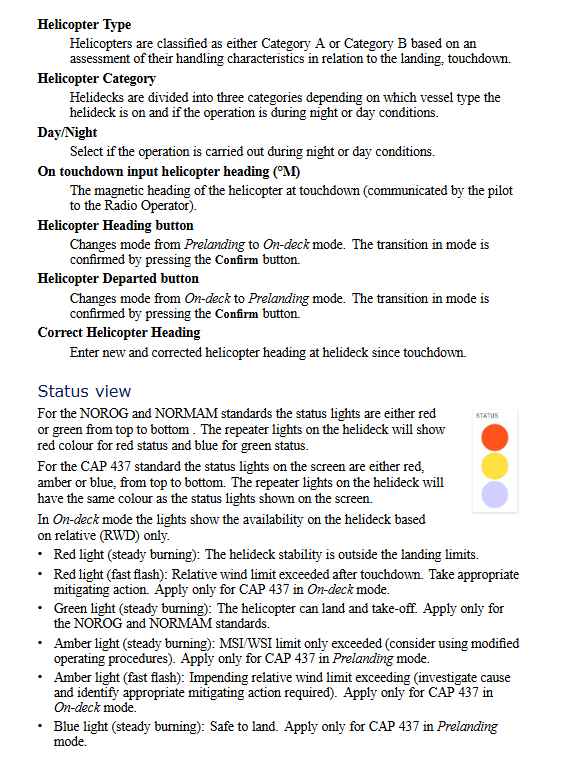 Blue: safe landing (always on, only CAP 437 pre landing mode); The relative wind direction is within the limit (slow flashing, only CAP 437 deck mode);
